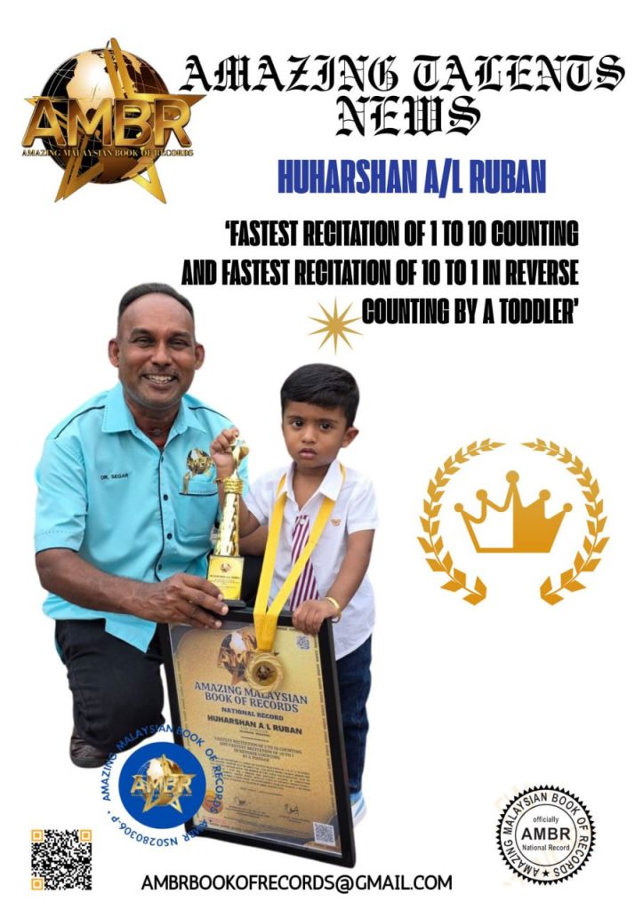 RECORDS ON HUHARSHAN A/L RUBAN ON FASTEST RECITATION OF 1 TO 10 ( 9 SECONDS) AND REVERSE COUNTING IN (9 SECONDS) TOO. THIS OUTSTANDING TALENTS MAKING HIM THE FASTEST TODDLER RECITE THE NUMBER IN THIS YOUNG AGE IN MALAYSIA. ALSO ON THE AGE OF 1 YEAR AND 6 MONTHS AND ADDITIONAL RECORDS OF IDENTYFYING COLOURS, ANIMALS, SHAPES, FRUITS, VEHICLES, PARTS OF THE BODY, WORDS FROM A – Z, SINGING RYHMES, & MANY MORE.